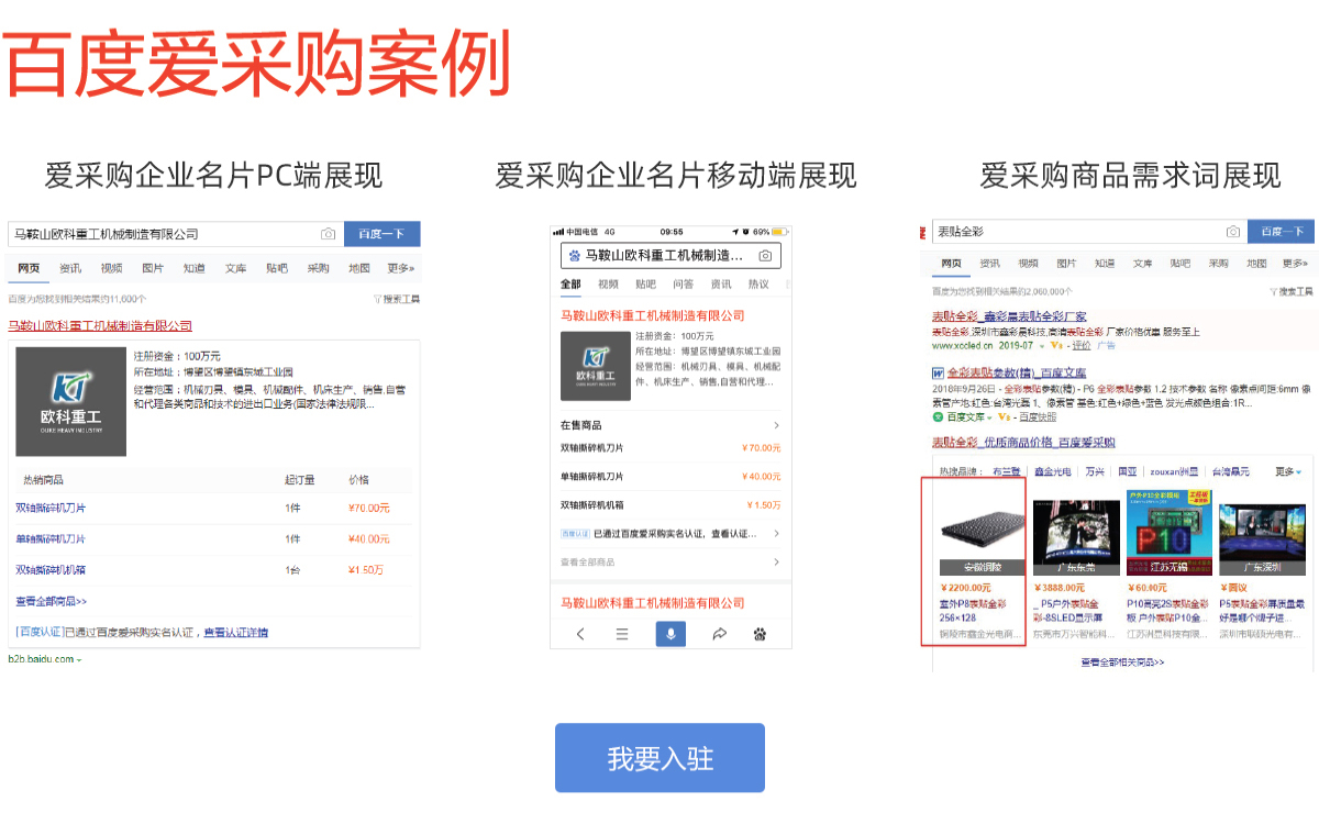 百度爱采购是百度旗下的B2B垂直搜索引擎,旨在帮助用户一站直达全网商品信息,触达海量优质商家。商家可通过百度爱采购与百度搜索无缝对接,满足用户对于采购信息检索的需求,同时为入驻企业找到精准买家。百度爱采购用AI帮助中小企业更好地解决采购批发渠道、货源问题